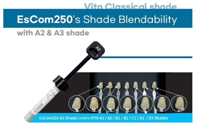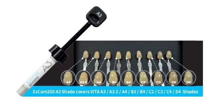 EsCom250 - φωτοπολυμεριζόμενη σύνθετη ρητίνη, νανο-υβριδική, για αποκαταστάσεις πρόσθιων και οπίσθιων δοντιών
